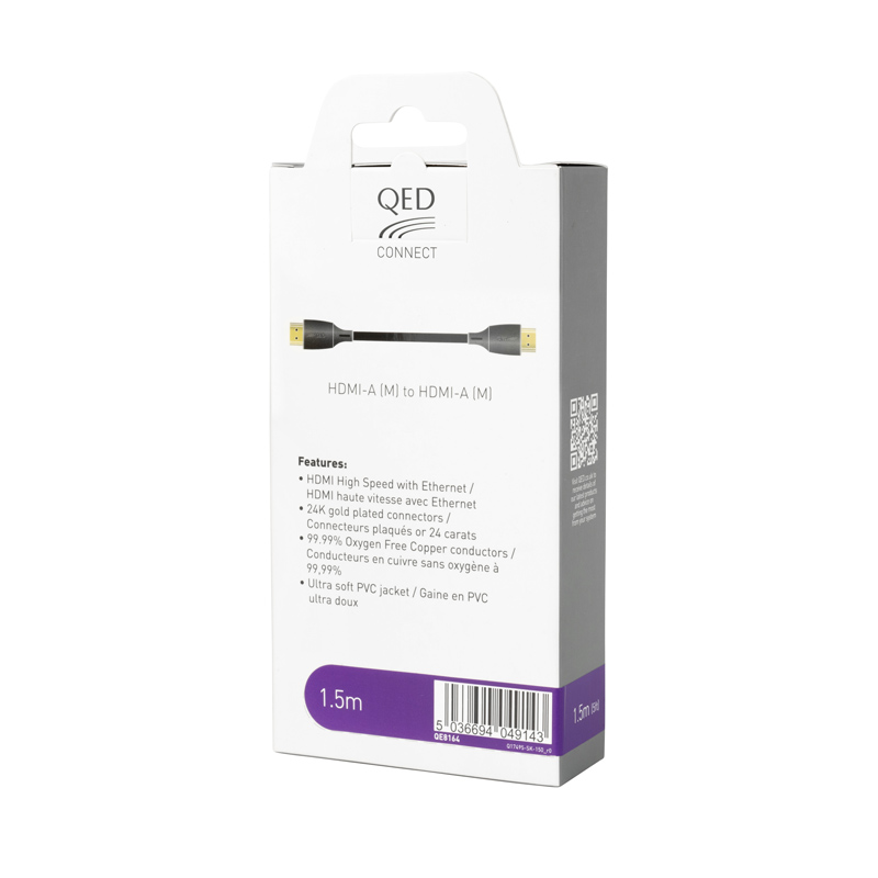 Cenovno ugoden kabel britanskega proizvajalca 'QED'. Uvršča se v novo vstopno serijo 'Connect', ki prinaša fleksibilen in vzdržljiv PVC ovoj v črni barvi, pozlačene konektorje (24 K) ter čiste bakrene vodnike (99,99 % OFC) za trajen in zanesljiv prenos avdio signala. Kabel je skladen z zahtevami standarda HDMI 2.0, kar pomeni, da zagotavlja podatkovni prenos do 18 Gbit/s. Zunanji premer kabla znaša 4,8 mm.