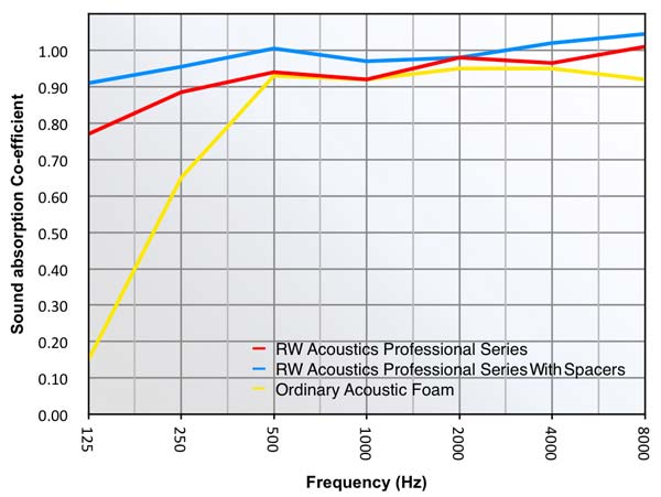 Prestižni akustični paneli slovenskega proizvajalca RW Acoustics so plod triletnega razvojnega sodelovanja akustikov, gradbenikov, arhitektov, oblikovalcev in končnih uporabnikov. Odlikuje jih visoka in frekvenčno linearna absorpcijska sposobnost ter izjemno natančna izdelava. Na spodnji sliki je prikazana primerjava absorpcijske sposobnosti navadne akustične pene ter akustičnih panelov RW Acoustics.