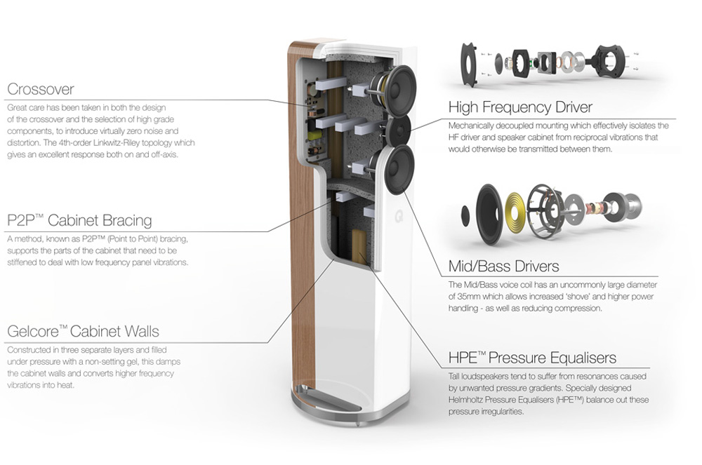 Presenetljiva globina, širina in višina zvočnega odra so rezultat visoko-kakovostnih zvočniških enot in premišljene zasnove ohišja, ki temelji na tehnologijah 'P2P' (dušenje nizko-frekvenčnih resonanc ohišja s selektivnim pozicioniranjem internih povezav), 'Gelcore' (pretvorba visoko-frekvenčnih resonanc ohišja v toploto) ter 'HPE' (izenačevanje tlaka znotraj ohišja).